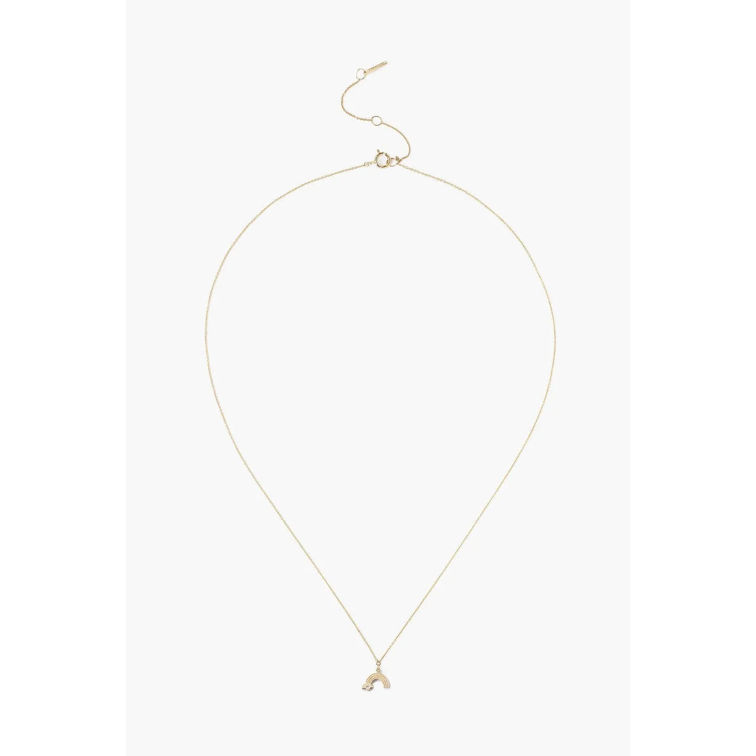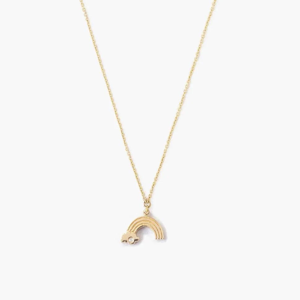 Playful yet elegant, this 14k gold necklace features a dainty rainbow charm with white diamond inlay. The perfect layering piece. Fastens with an adjustable ring clasp closure.