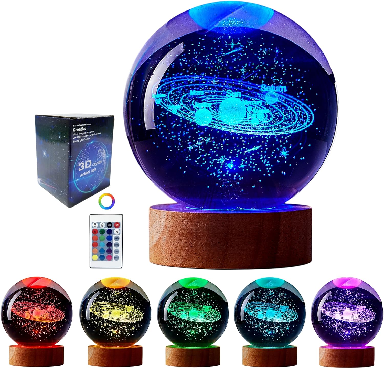 - 【Perfect Gift & Decoration】: The product include one 3.15 inch Galaxy K9 Crystal Ball; 1 wooden base with USB Cable; 1 Remote Control;Beautiful color box packaging. This beautiful 3D Galaxy Crystal Ball night light can be given as a gift.All 3D Galaxy Crystal Ball lamp are carefully checked before sale. We strive to offer our customer the best product and service. Any problem please feel free to contact us for after sale service.