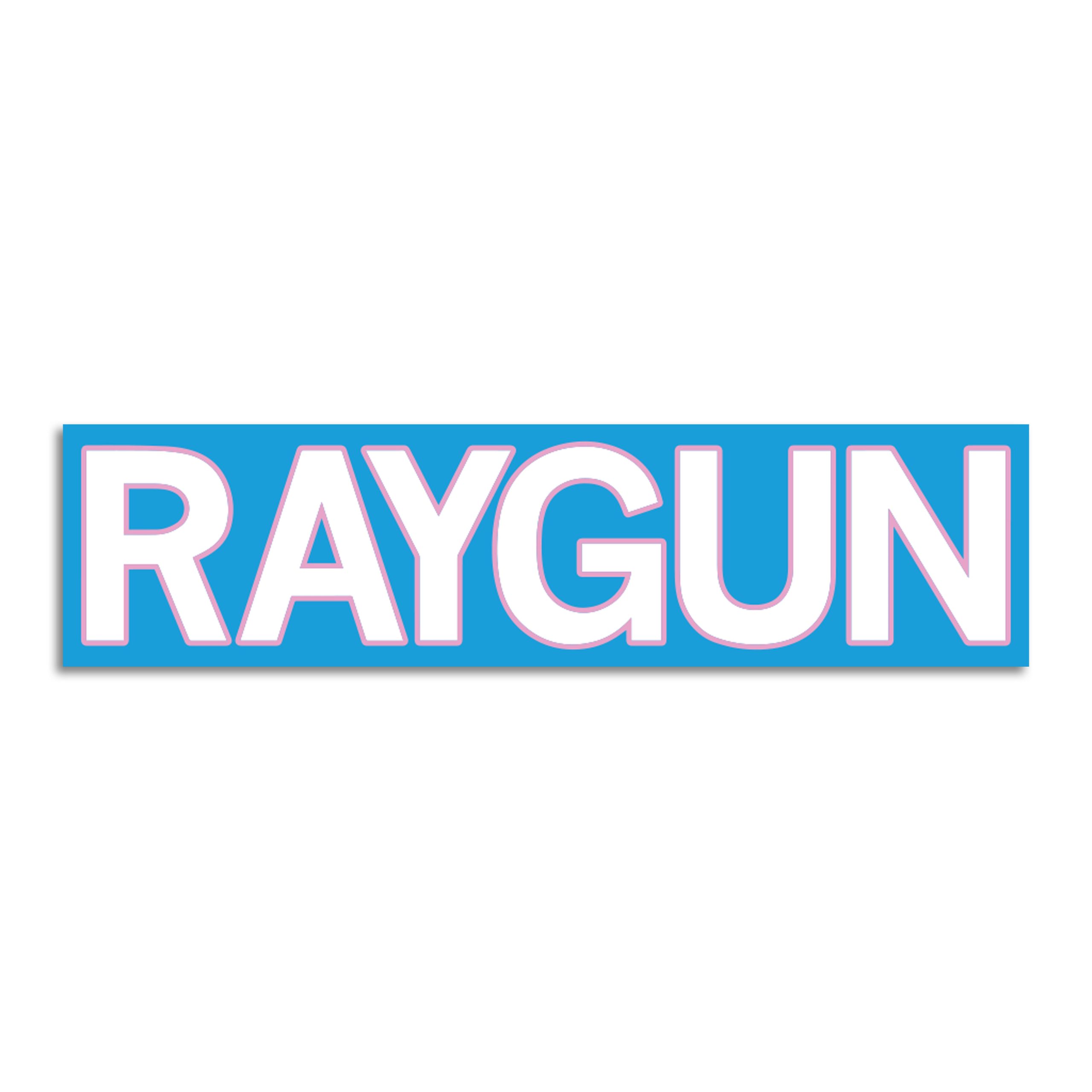 RAYGUN Block Text Logo Blue & Pink. 5″ x 1.25″ Vinyl sticker. Designed by RAYGUN and printed by Sinclair Graphics in Des Moines, IA.