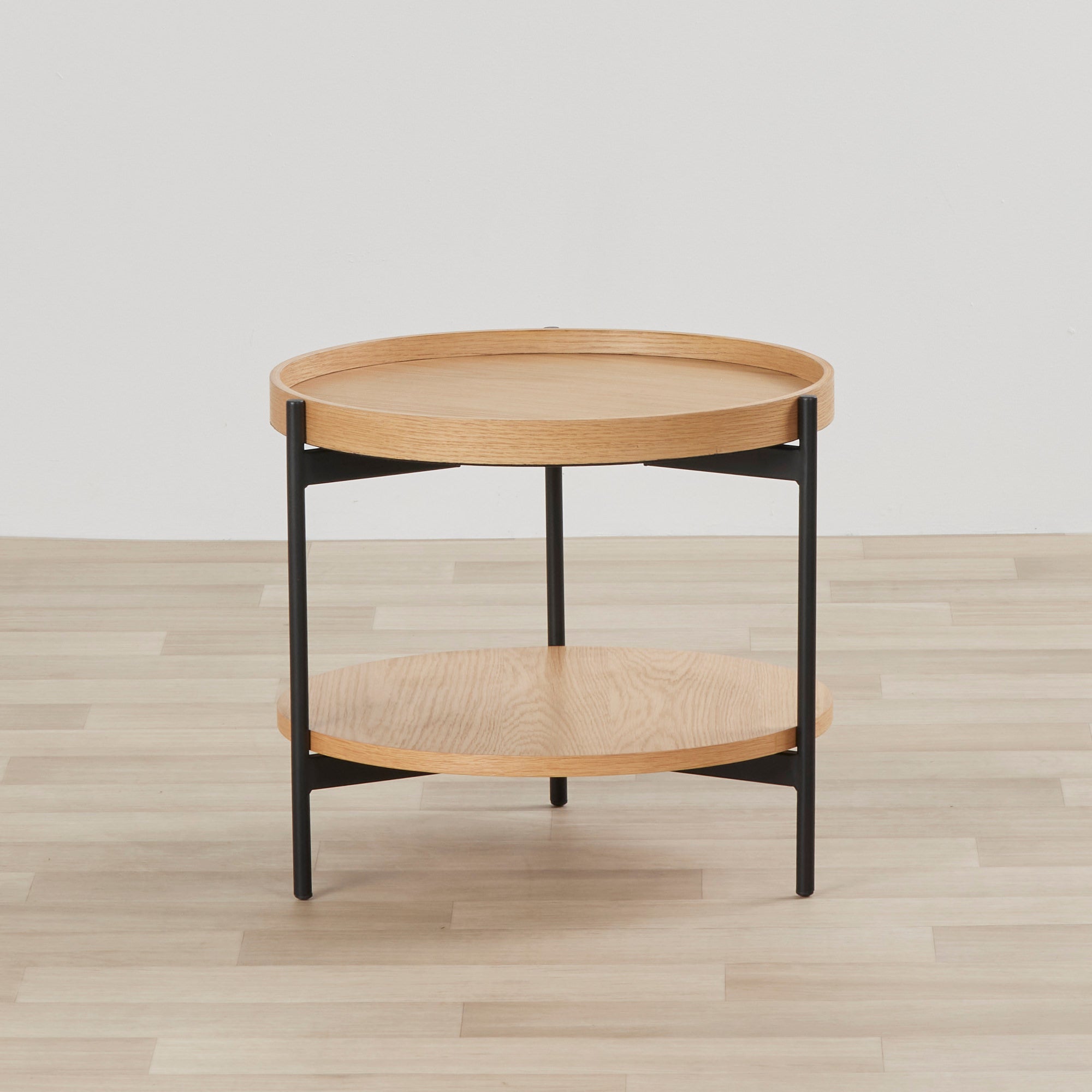 With dual shelves, the Rhys Side Table offers space for placing glassware and styling your favourite home décor. The black framing complements its oak tones.