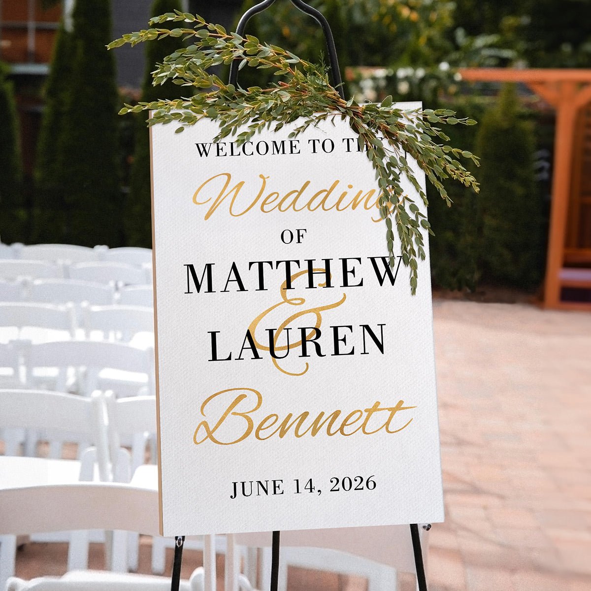 - Personalized “Welcome to our Wedding” sign with two names, shared surname, and date