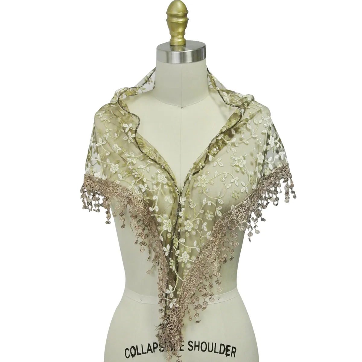 This triangle scarf features floral lace trim and embroidery for an elegant and feminine touch. Made out of lightweight fabric, it is perfect for formal occasions or for dressing up a casual outfit. Wear this scarf a number of ways as a shawl, bandana, around the neck, or over the head for a varied look.